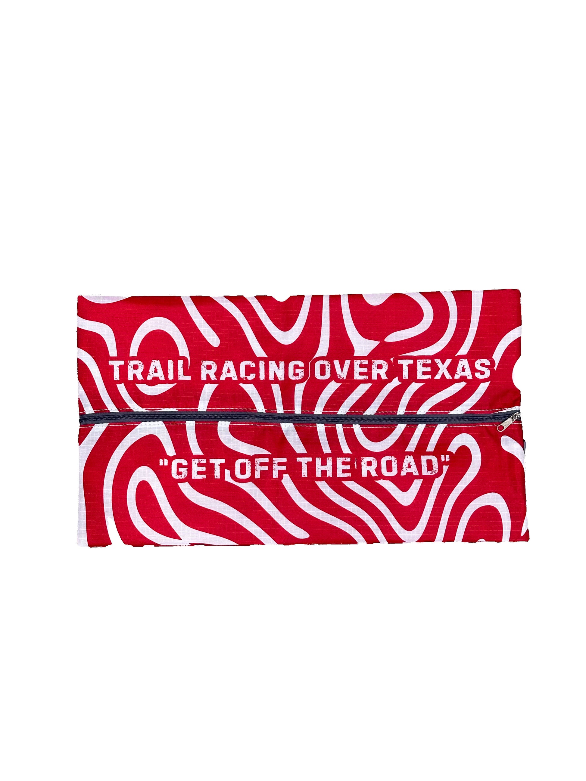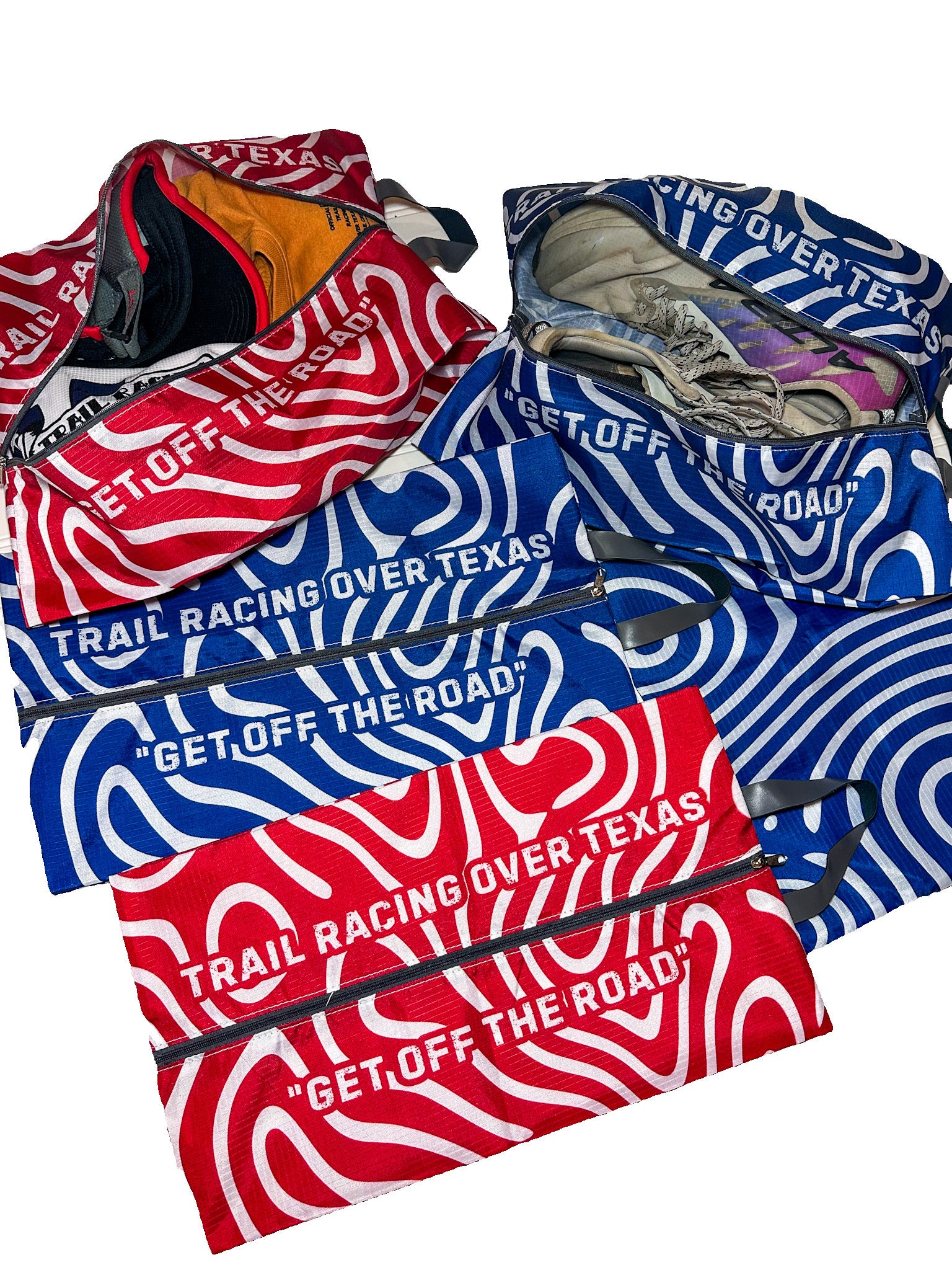 Available in Trail Racing Over Texas Red or Blue, each bag features our signature topo-inspired design and bold “GET OFF THE ROAD” branding—because trail miles matter.
